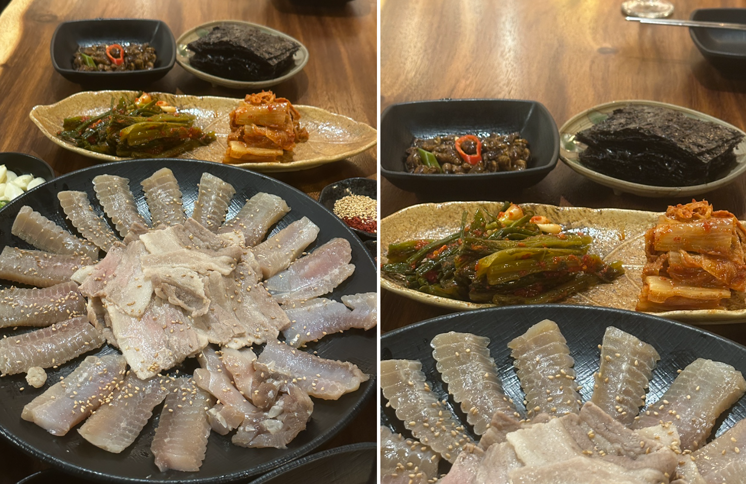 - 흑산도 홍어삼합: 숙성 홍어, 수육, 갓김치, 묵은김치 구성. 김치류가 진짜 갓…! 입문자에게도 부담 없는 숙성도